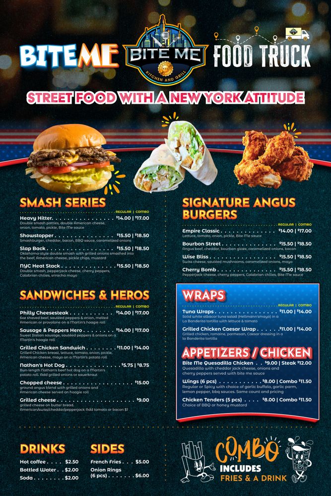 At NYC Bite Me, we bring the vibrant flavors of New York City right to your street. Our food truck offers a diverse menu inspired by the city's rich culinary heritage and street food culture.